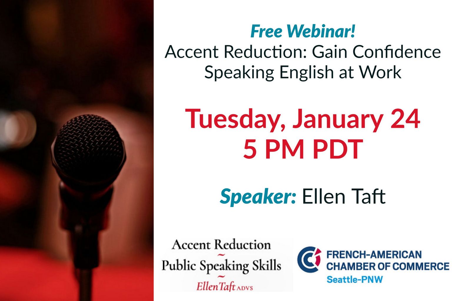Gain confidence speaking English at work by registering to attend the second session of the Accent Reduction Seminar series hosted by the French American School of Puget Sound. The free webinar will feature speaker Ellen Taft and will focus on Public speaking skills.