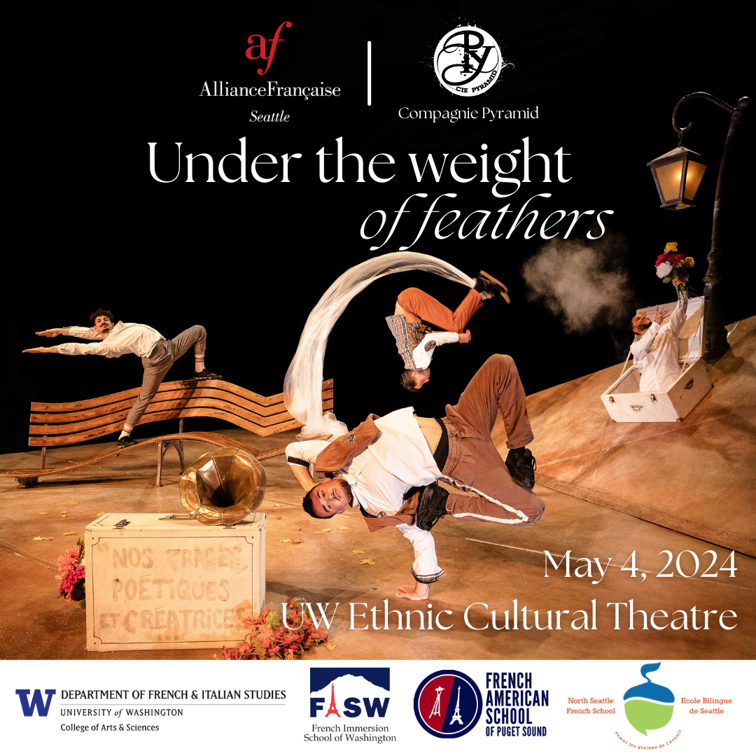 We are happy to partner with the Alliance Française de Seattle, who is hosting the US tour of Compagnie Pyramid's dance and theater show Compagnie Pyramid’s dance and theater show Under the Weight of Feathers (Sous le poids des plumes), a lively piece of poetry, storytelling and burlesque play. Throughout their choreography and playful acting, four dancers embark on a poetic journey and offer us glimpses of everyday life, tender, humorous, and a bit mischievous. This will be the only performance in Seattle.