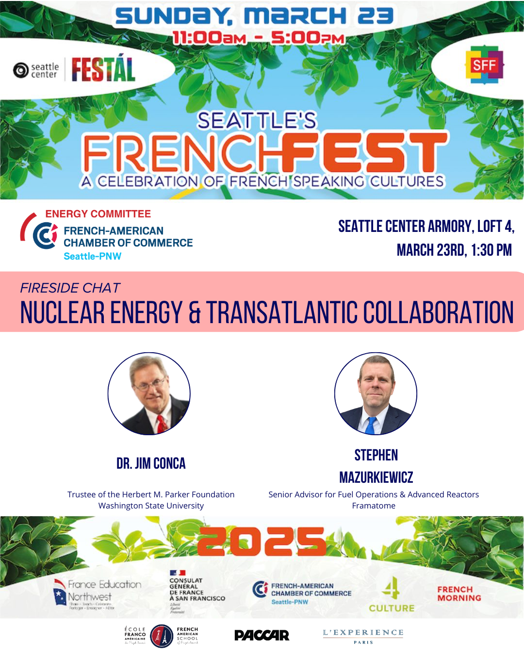 Join us as we are inaugurating the Energy Committee of the French American Chamber of Commerce Seattle PNW, with our first event ever, an engaging fireside chat on Nuclear Energy & Transatlantic Collaboration, exploring the dynamic partnership between France and the United States in advancing nuclear energy. This discussion will highlight cutting-edge innovations, the role of nuclear power in clean energy strategies, and the opportunities for deeper collaboration in the sector.