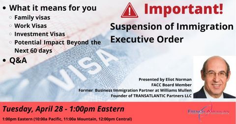 This suspension is just the beginning and there is no guarantee the halt to certain types of visas will end in 60 days or will not be expanded to additional visa categories. A member of the FACC of D.C.'s Board of Directors and an immigration attorney, Eliot Norman will answer questions and cover what is and what is not in the new Suspension of Immigration Executive Order and its impact.