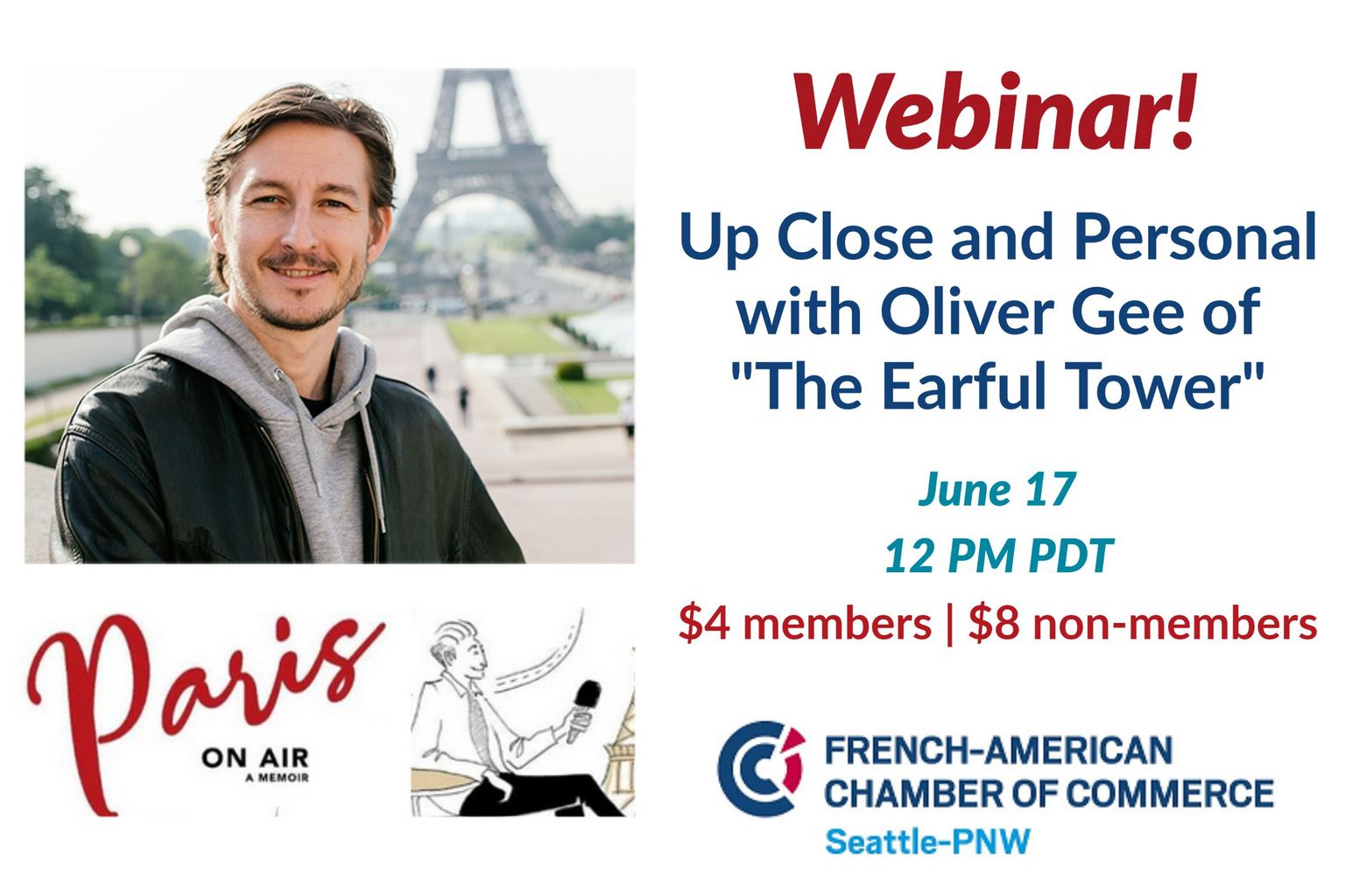 You can join a live virtual meeting with Oliver on Wednesday, June 17, at 12 noon PDT, via Zoom. The session will be mostly in English with a smattering of French terms. Look for a lively Q&A session led by Eric Beaulieu and Linda Witt of the FACC PNW. Oliver will share his tips on Paris, the French language, on how he has built up his career in the French capital, and more. Tickets are $4 for FACC PNW and Alliance Française members and $8 for nonmembers. Registrants will receive an exclusive discount code for a hot-off-the-press copy of his memoir, which ships from a warehouse on the west coast in just days.