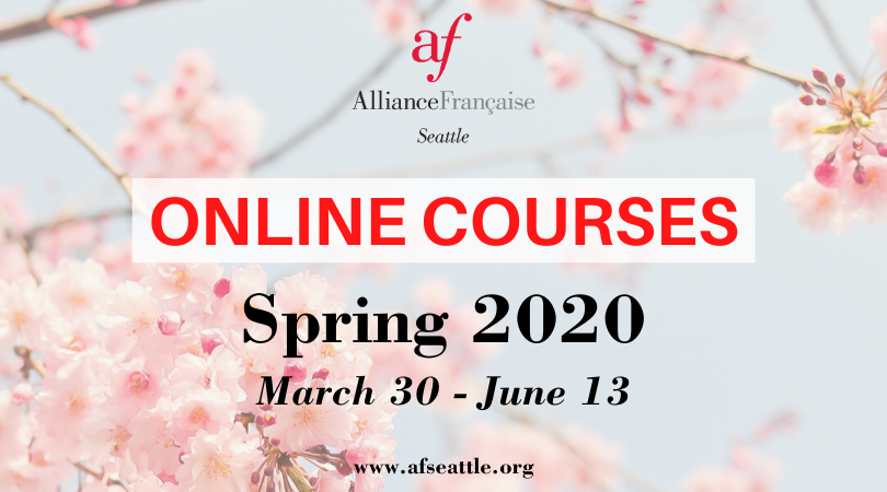 Due to the COVID-19 outbreak and the directives of the state of Washington, the Alliance Française de Seattle will start its Spring 2020 term fully online. Online French courses follow the usual format, course plan, and learning objectives. They are limited to 6 participants for best results, and are supported by live video classes, an e-learning platform, and a variety of additional e-learning resources to offer an efficient, professional, fun, and interactive experience. See you online!